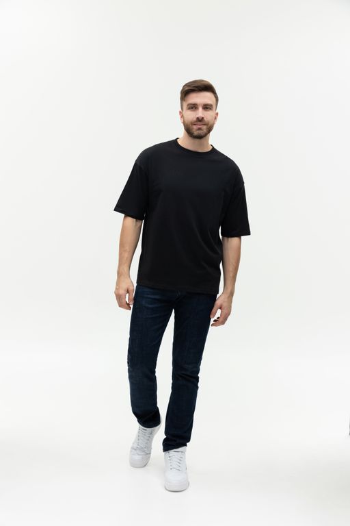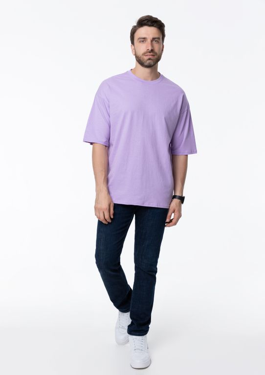 Свободная футболка силуэта-oversize с округлым воротом и спущенной линией плеча. Универсальная модель идеально впишется как в мужской, так и в женский гардероб.
