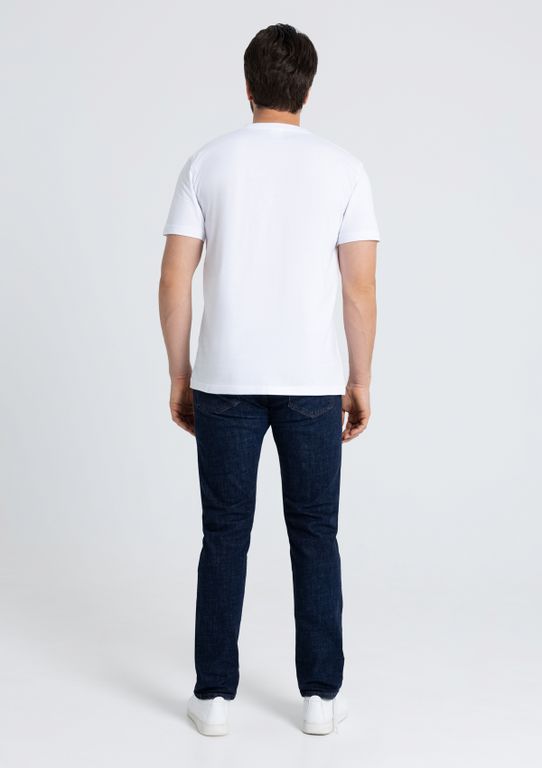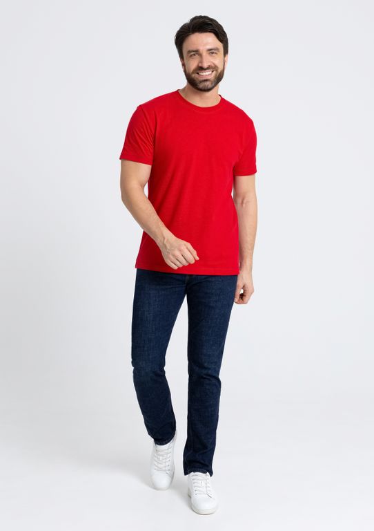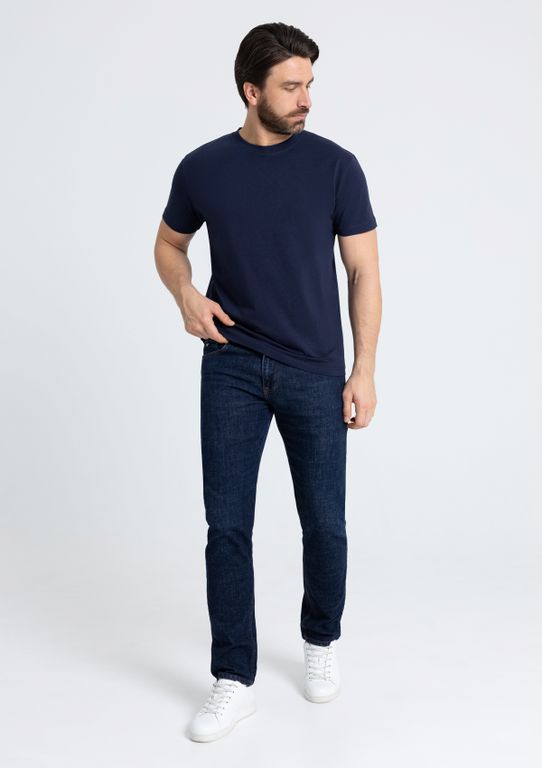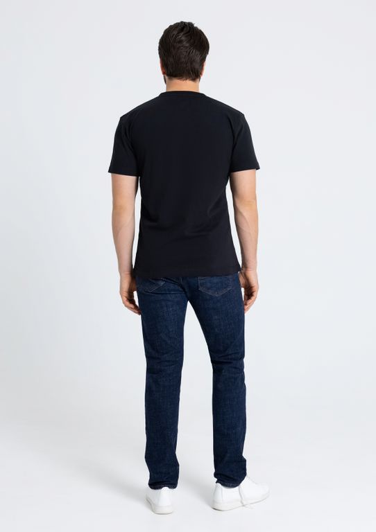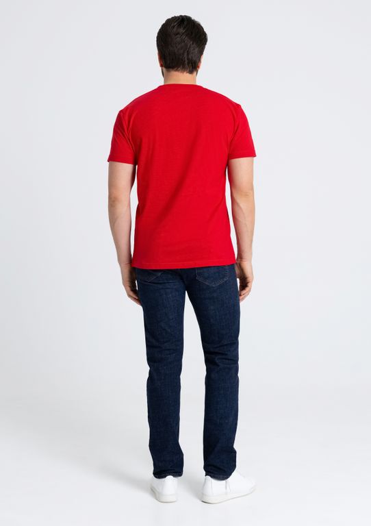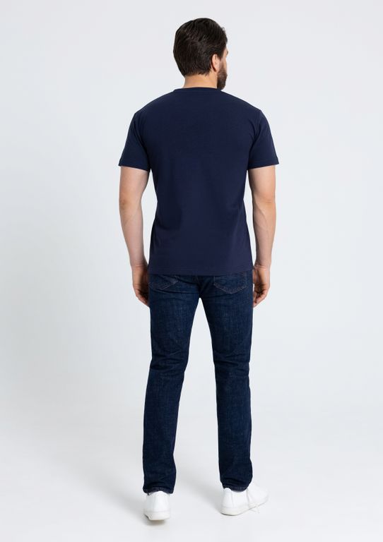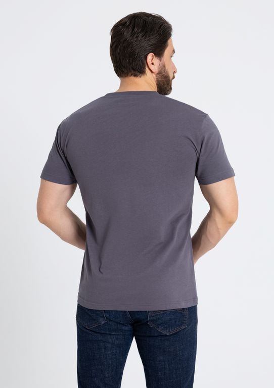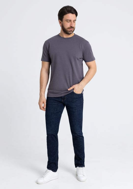 Мужская футболка прямого силуэта с округлым воротом и втачным рукавом. Шов горловины спинки и плечевые швы усилены бейкой из основного полотна.